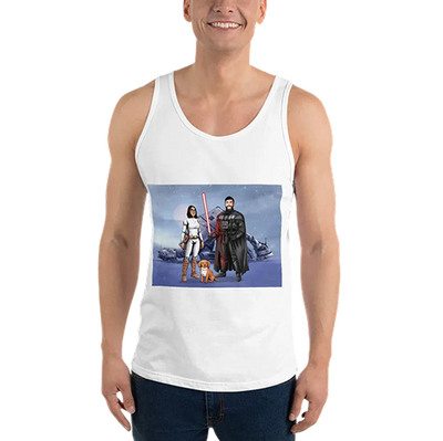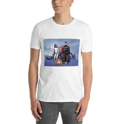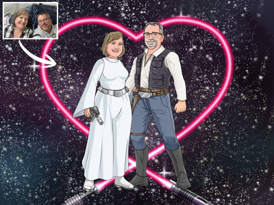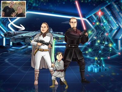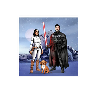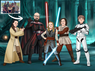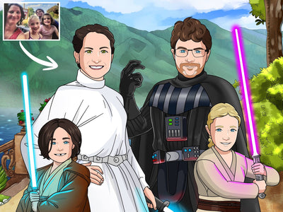 Personalize your Jedi cartoon portrait in minutes: pick a background, set the number of people and pets, choose shoulders-only or full-body, and leave notes for special requests.